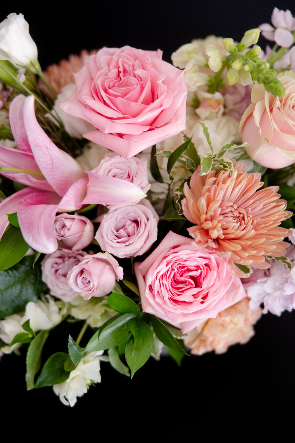 The Pretty in Pink Medium Arrangement features an abundance of seasonal pink florals. Featuring lilies, roses, snapdragons and fresh greenery, this arrangement is arranged in Sage 'n' Bloom's signature garden style. This Pretty in Pink Arrangement arrangement comes in a medium vase, approximately 5" x 5".